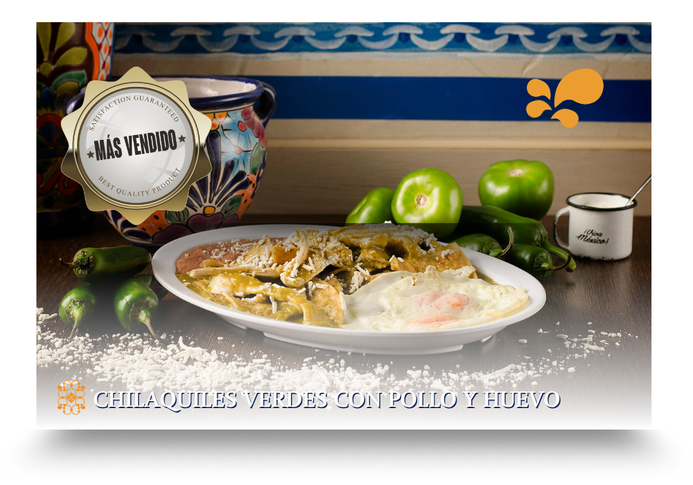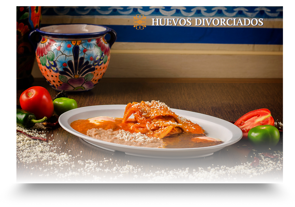 Estrellados o revueltos en salsa roja y la famosa salsa negra, acompañados de chilaquiles rojos o verdes al centro.