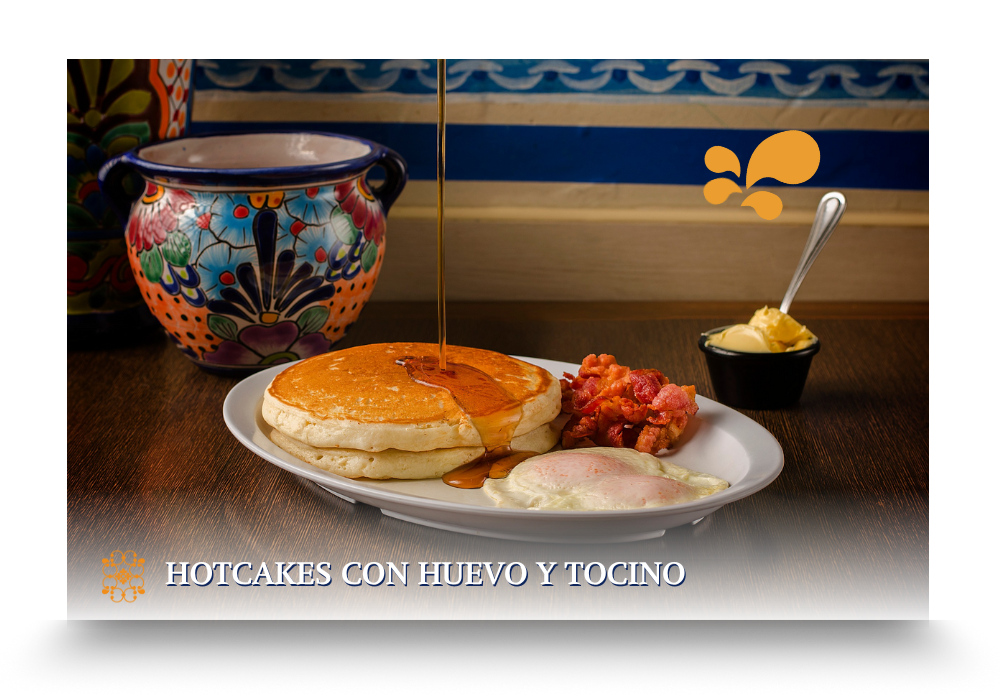 2 Hot Cakes esponjosos con 2 huevos estrellados o revuéltos con tocino crujiente o jamón.